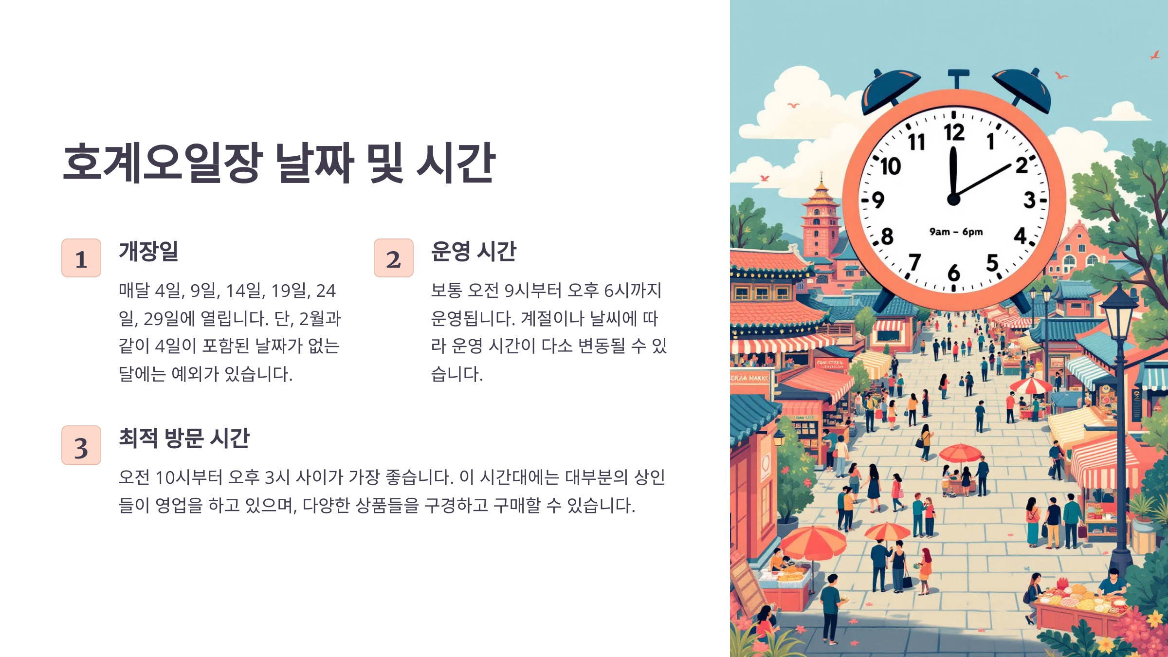 호계오일장을 방문하기 가장 좋은 시간대는 오전 10시부터 오후 3시 사이입니다. 이 시간대에는 대부분의 상인들이 자리를 잡고 영업을 하고 있으며, 다양한 상품들을 구경하고 구매할 수 있습니다. 또한, 점심시간에 맞춰 맛있는 먹거리를 즐길 수도 있습니다.