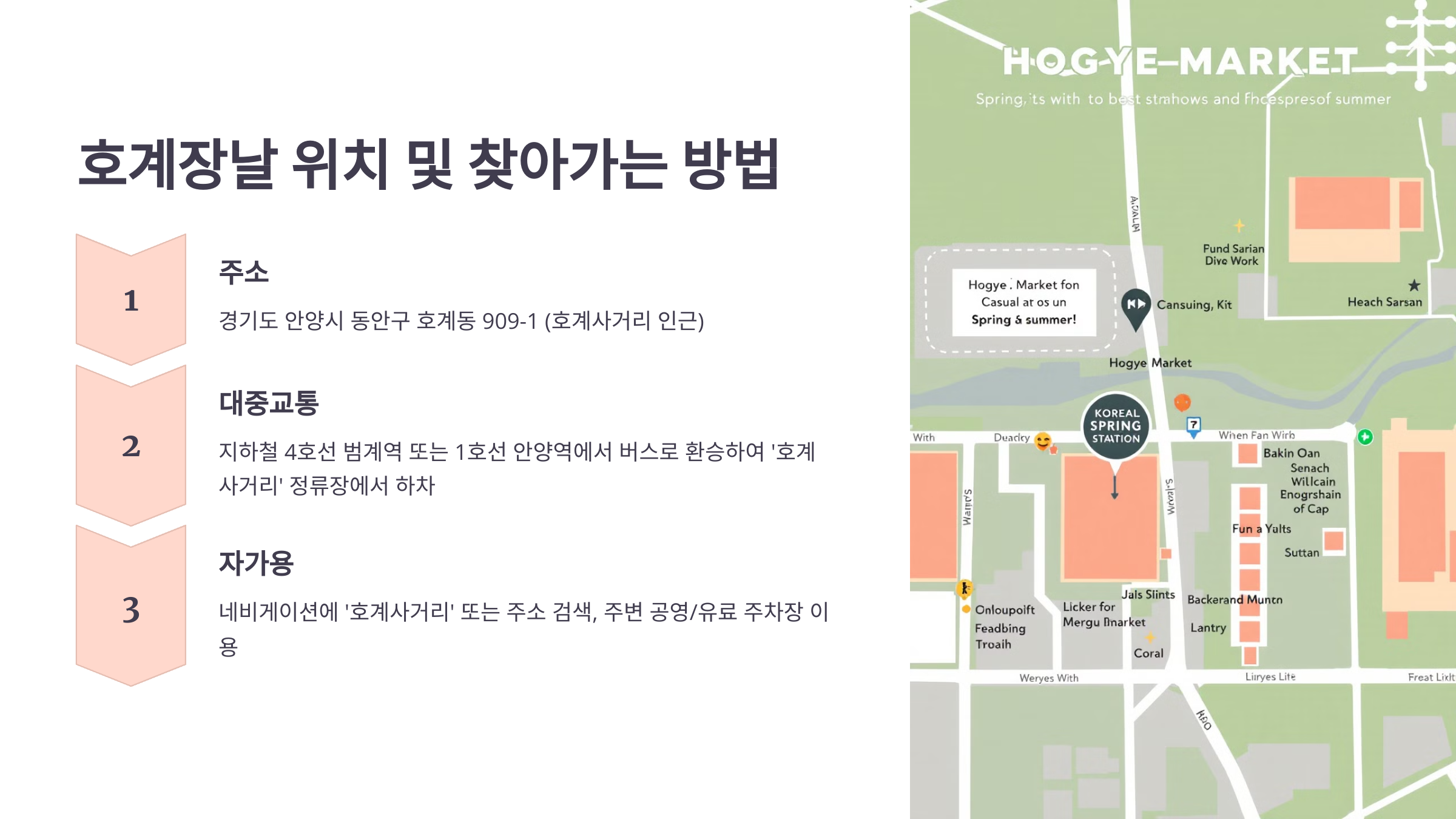 호계장날은 경기도 안양시 동안구 호계동 호계사거리 인근에서 열립니다. 정확한 주소는 '경기도 안양시 동안구 호계동 909-1' 또는 '호계사거리'를 검색하면 쉽게 찾을 수 있습니다. 대중교통, 자가용, 도보 등 다양한 방법으로 방문할 수 있으며, 각각의 장단점을 고려하여 자신에게 맞는 방법을 선택하는 것이 좋습니다.
