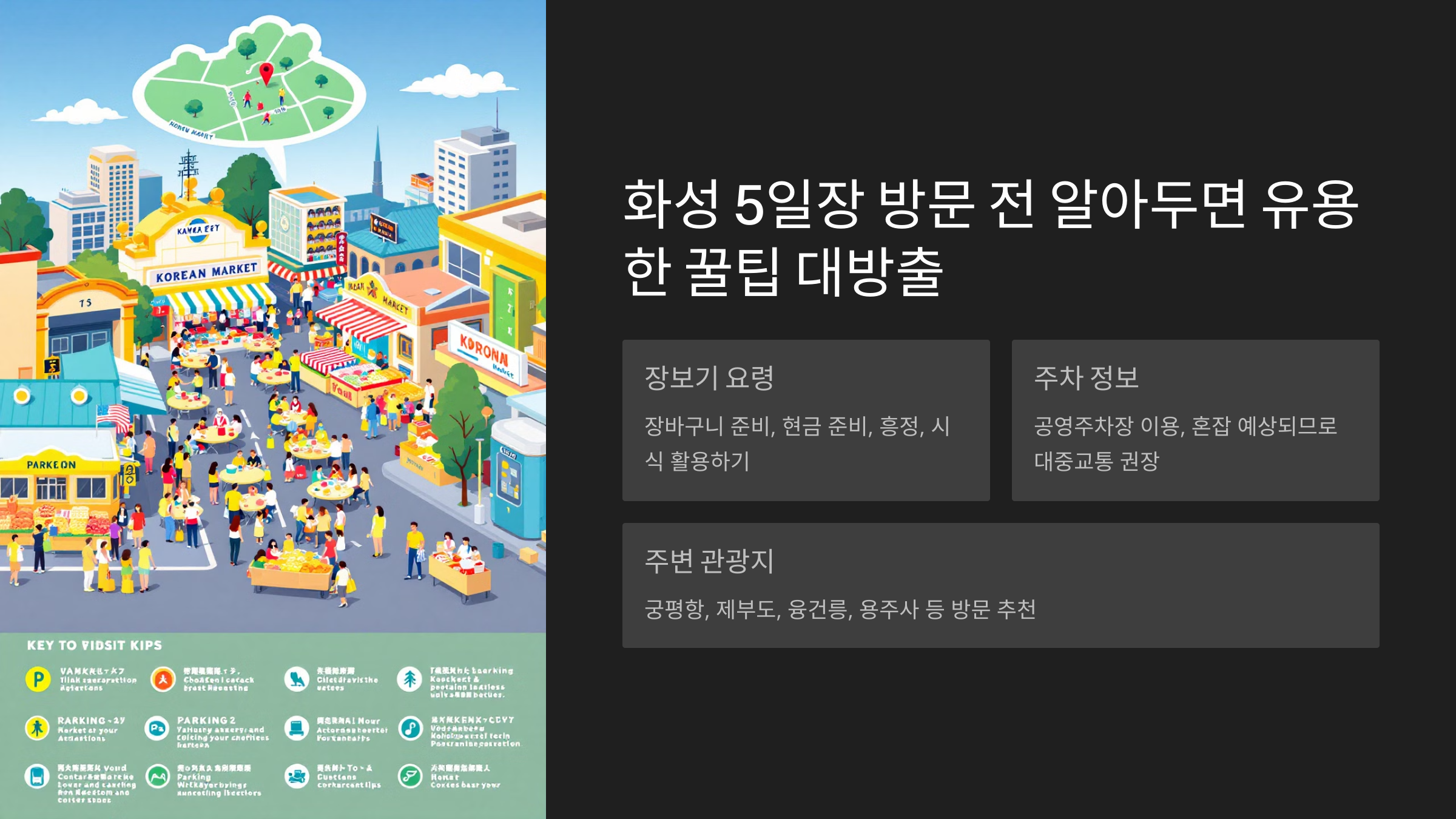 화성오일장을 더욱 알차고 즐겁게 즐기기 위한 꿀팁을 소개합니다. 장보기 요령부터 주차 정보, 교통편까지! 미리 알아두면 더욱 편리하게 화성오일장을 이용할 수 있습니다.