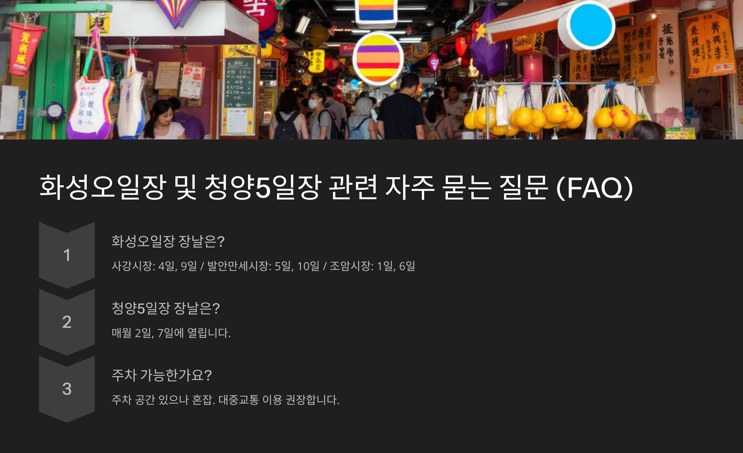 화성오일장에 대한 궁금증을 해결해 드립니다. 장날 날짜, 위치, 교통편 등 자주 묻는 질문들을 모아 상세하게 답변해 드립니다.