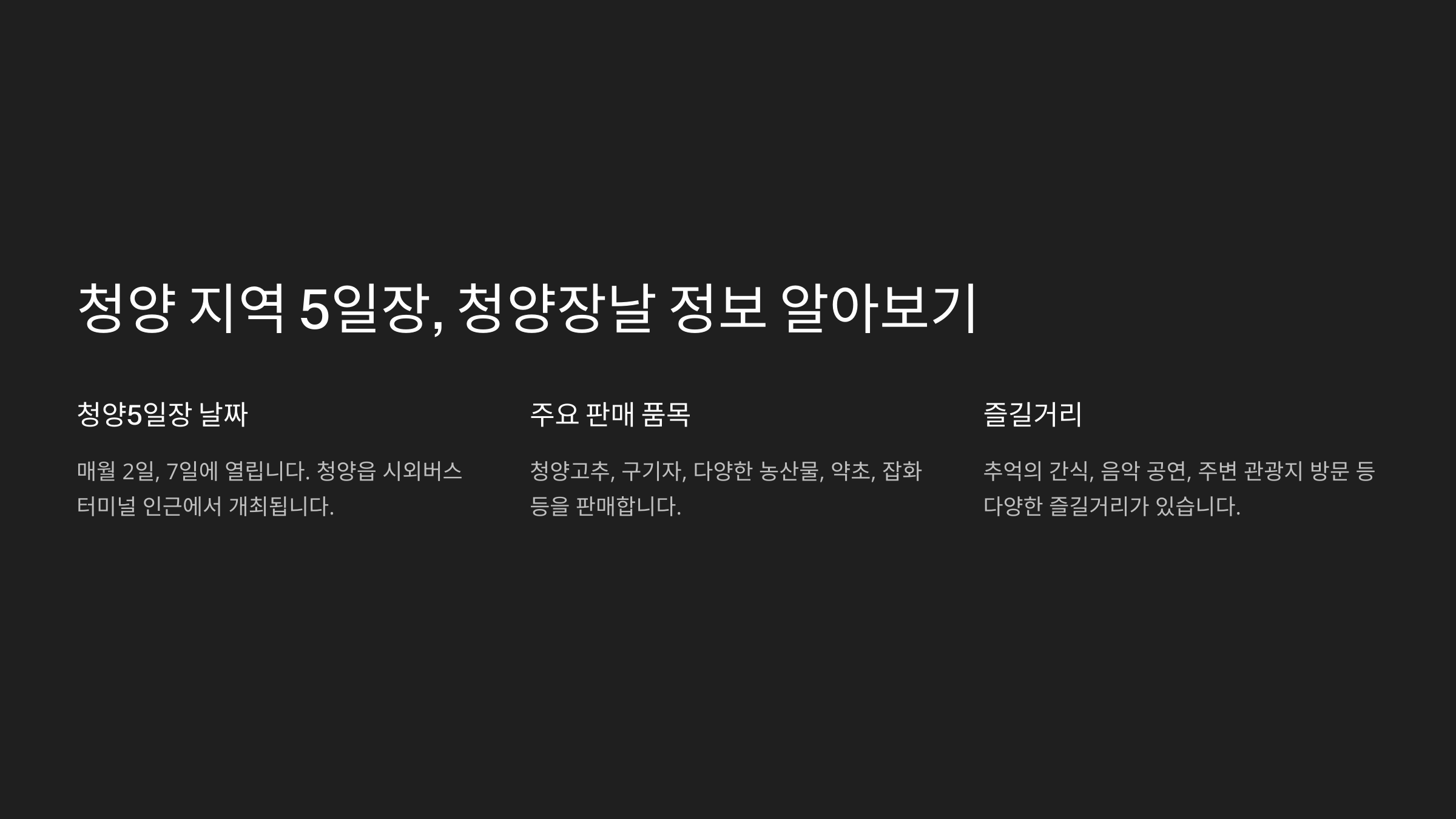| 청양5일장 | 2일, 7일 | 고추, 구기자, 농산물, 약초, 잡화 | 청양 대표 특산물 판매, 다양한 볼거리와 즐길거리 제공 |