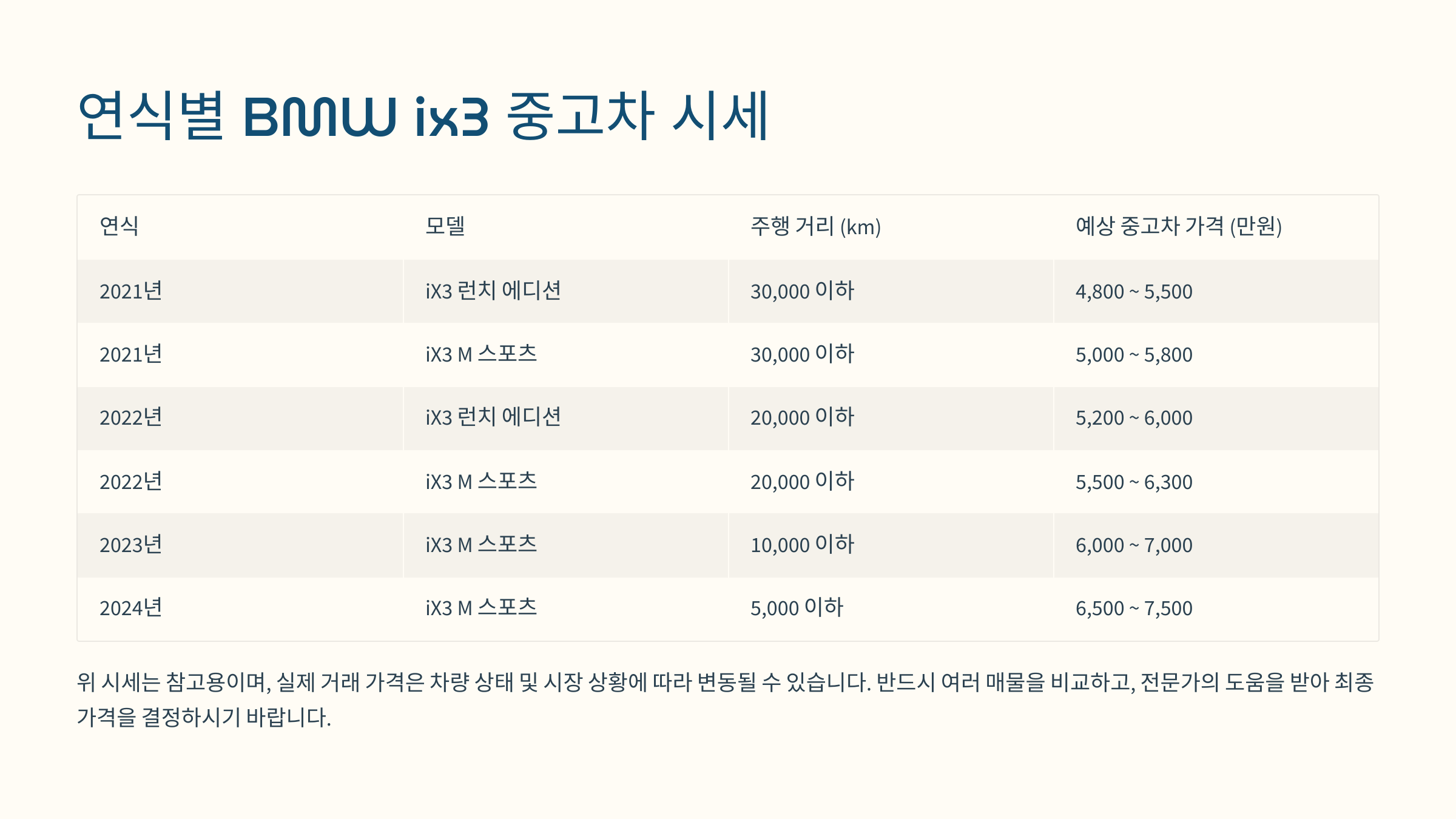 | 2023년 | iX3 M 스포츠 | 10,000 이하 | 6,000 ~ 7,000 | 최신 연식 모델로, 최신 기술과 편의 기능이 적용되었습니다. |