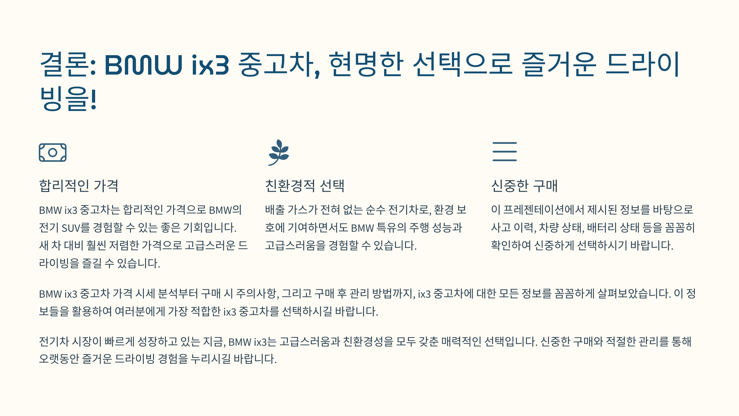 결론: BMW ix3 중고차, 현명한 선택으로 즐거운 드라이빙을!