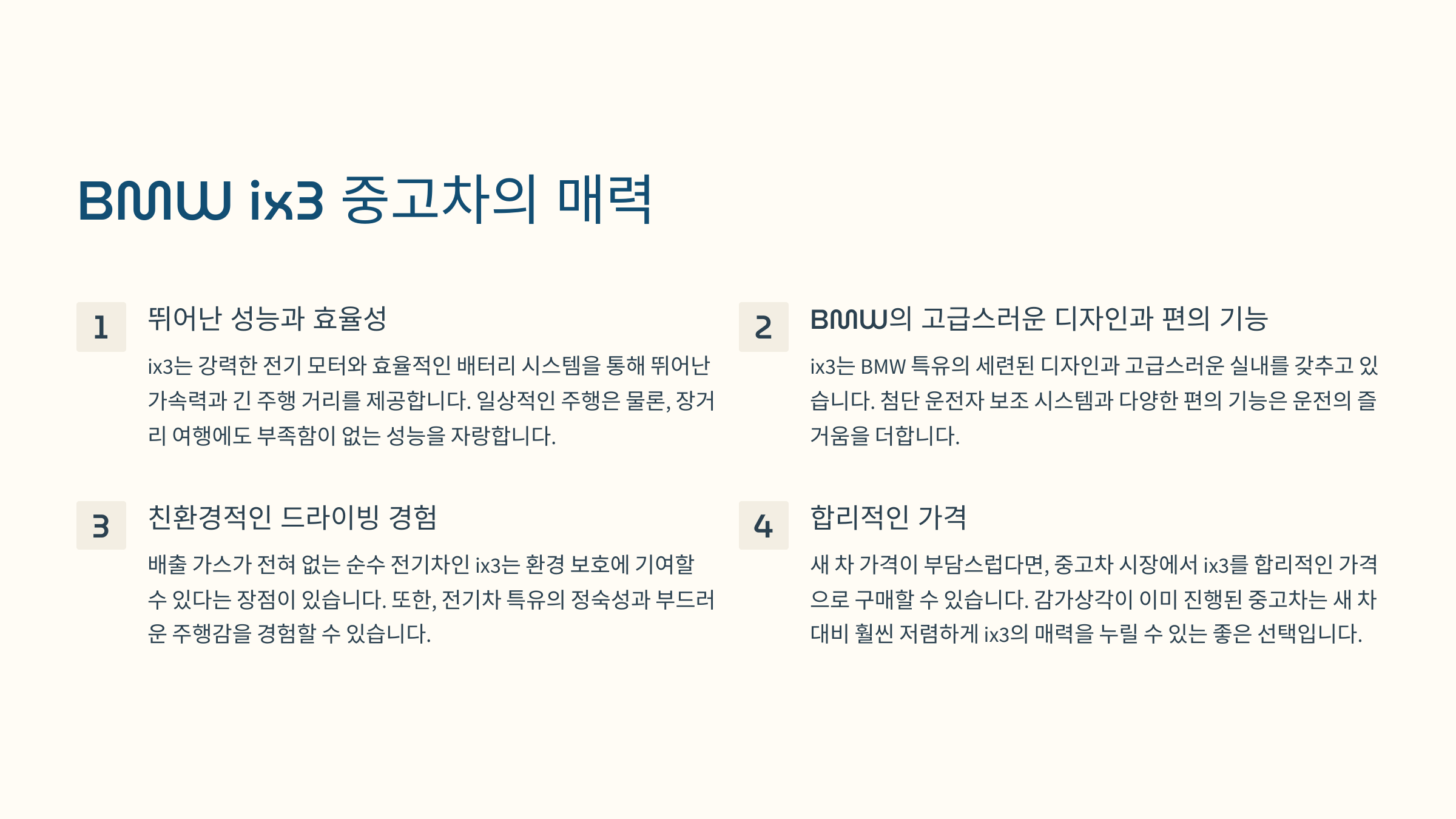 - 합리적인 가격: 새 차 가격이 부담스럽다면, 중고차 시장에서 ix3를 합리적인 가격으로 구매할 수 있습니다. 감가상각이 이미 진행된 중고차는 새 차 대비 훨씬 저렴하게 ix3의 매력을 누릴 수 있는 좋은 선택입니다.