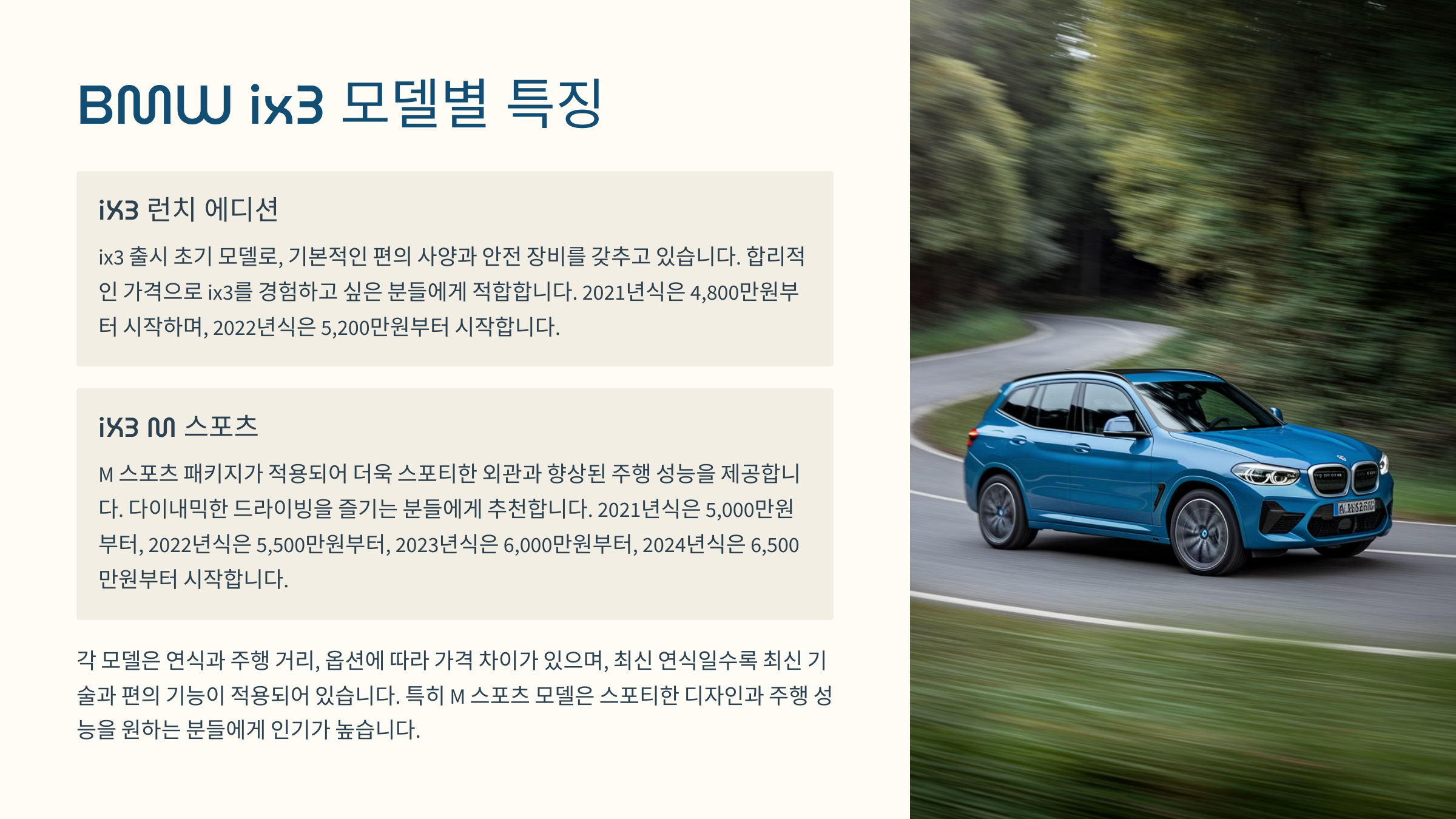 2021년 | iX3 런치 에디션 | 30,000 이하 | 4,800 ~ 5,500 | ix3 출시 초기 모델로, 풍부한 옵션과 합리적인 가격이 특징입니다. |
