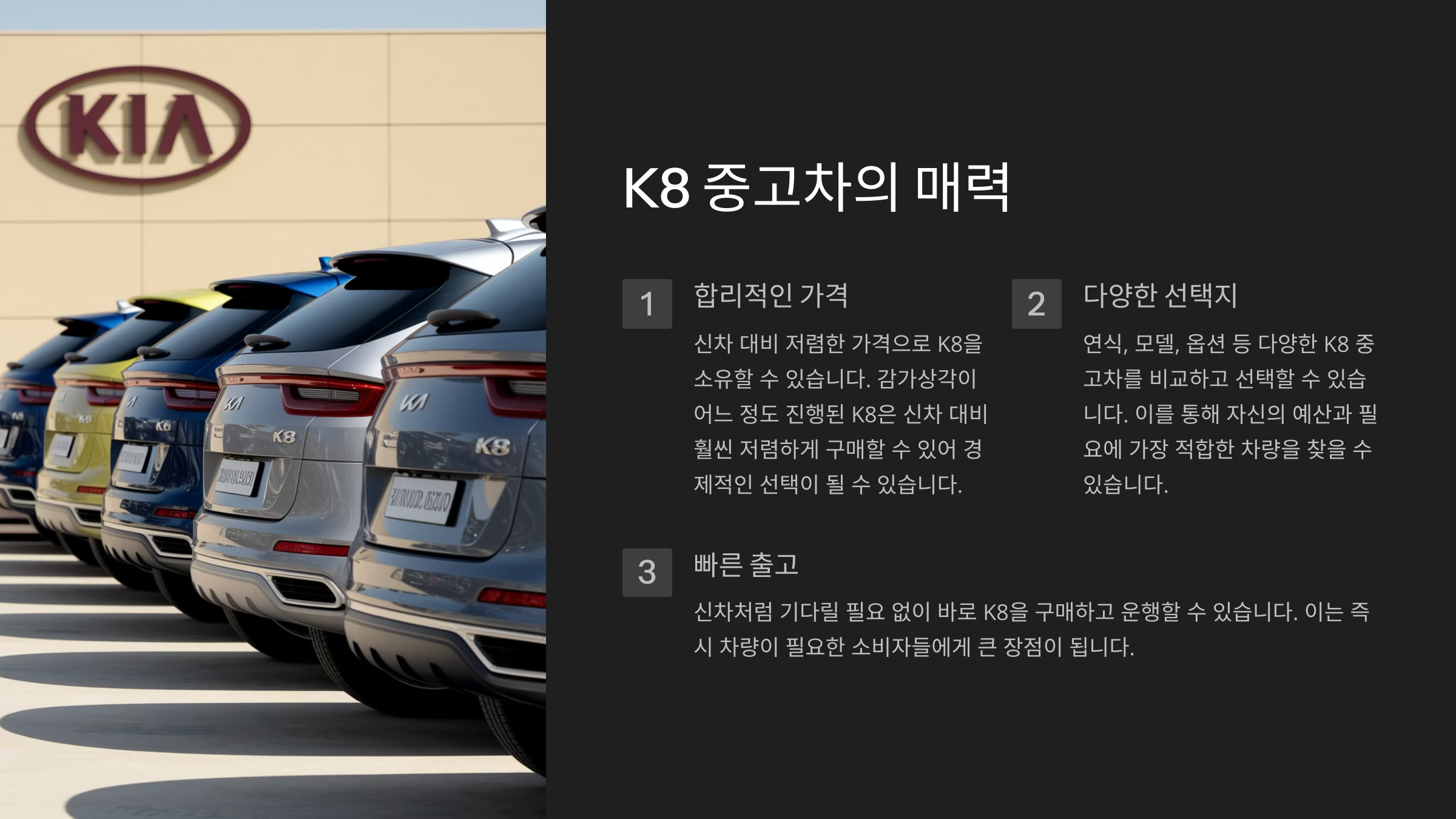 - 빠른 출고: 신차처럼 기다릴 필요 없이 바로 K8을 구매하고 운행할 수 있습니다.