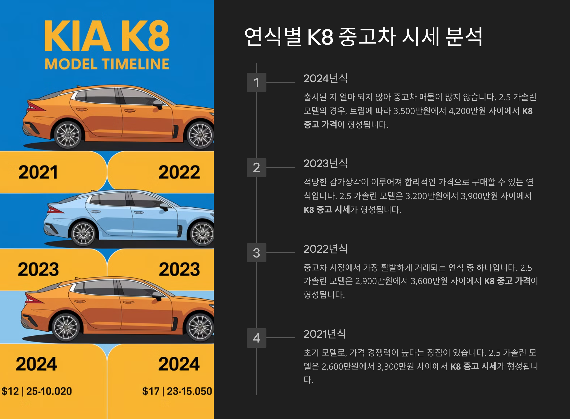 아래 표는 최근 5년간 K8 중고차 시세를 나타낸 것입니다. (실제 중고차 매물 데이터를 기반으로 작성되었으며, 시세는 시장 상황에 따라 변동될 수 있습니다.)