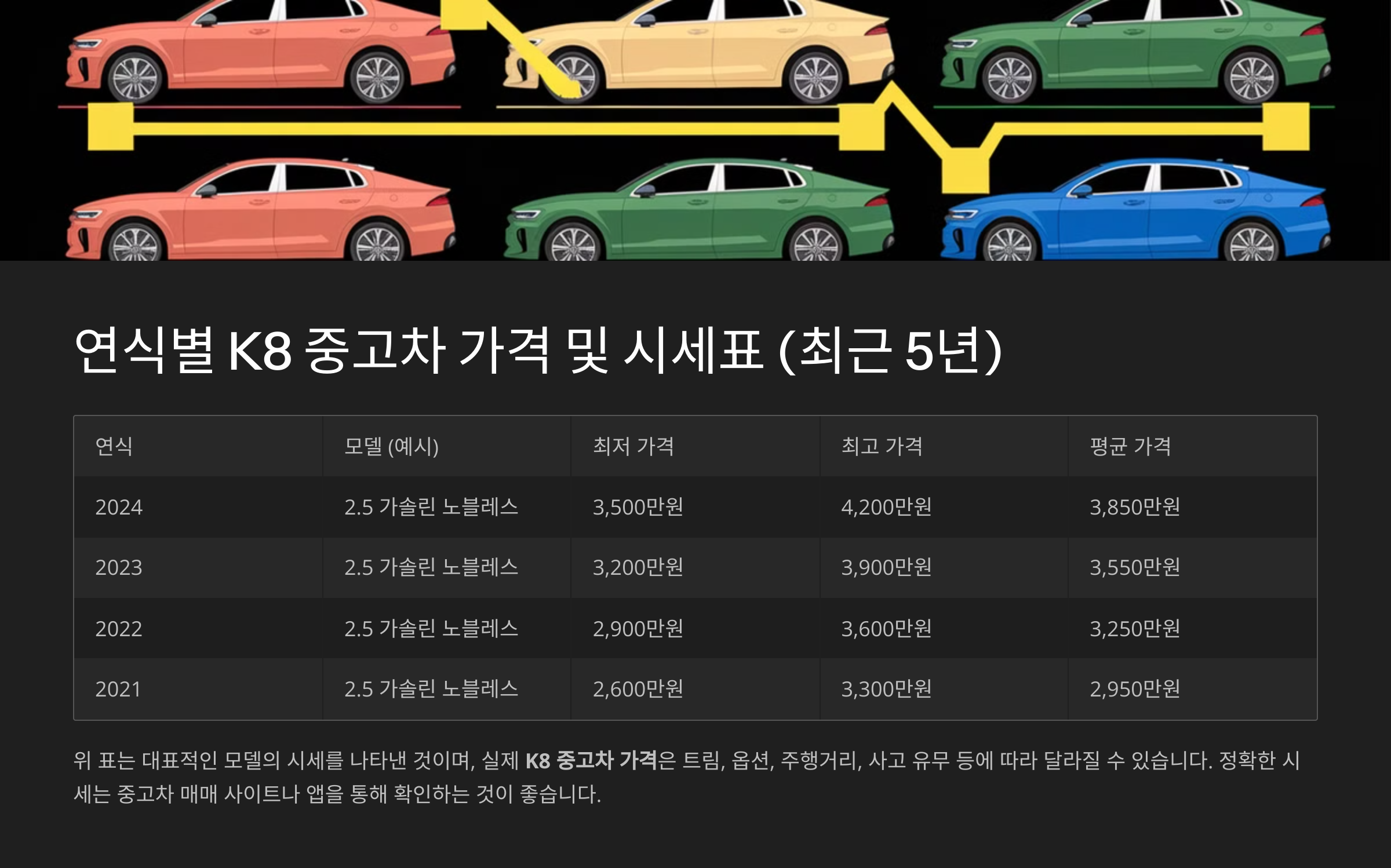 - 위 표는 대표적인 모델의 시세를 나타낸 것이며, 실제 K8 중고차 가격은 트림, 옵션, 주행거리, 사고 유무 등에 따라 달라질 수 있습니다.