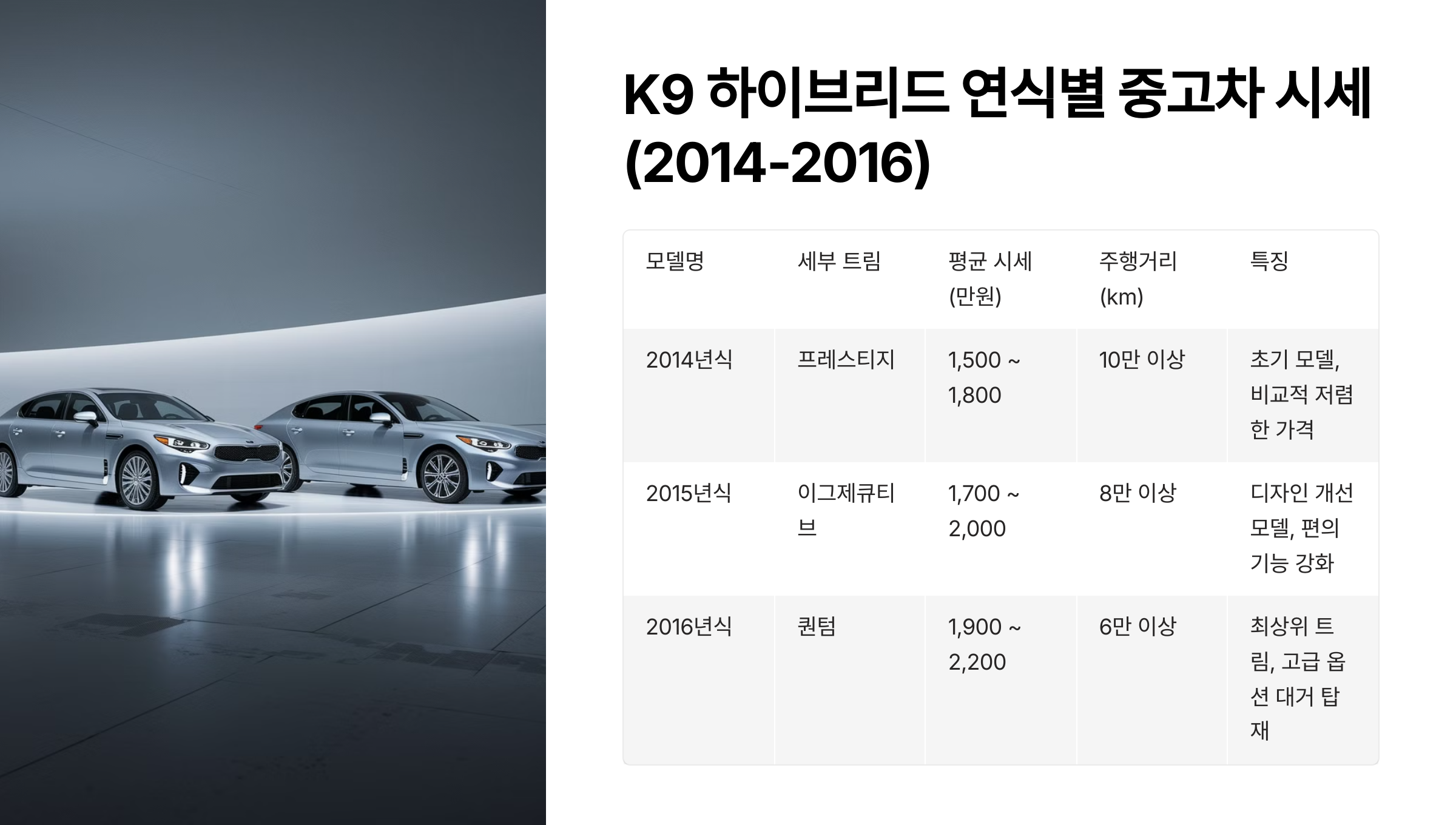 | K9 하이브리드 2014년식 | 프레스티지 | 1,500 ~ 1,800 | 10만 이상 | 초기 모델, 비교적 저렴한 가격으로 구매 가능 |