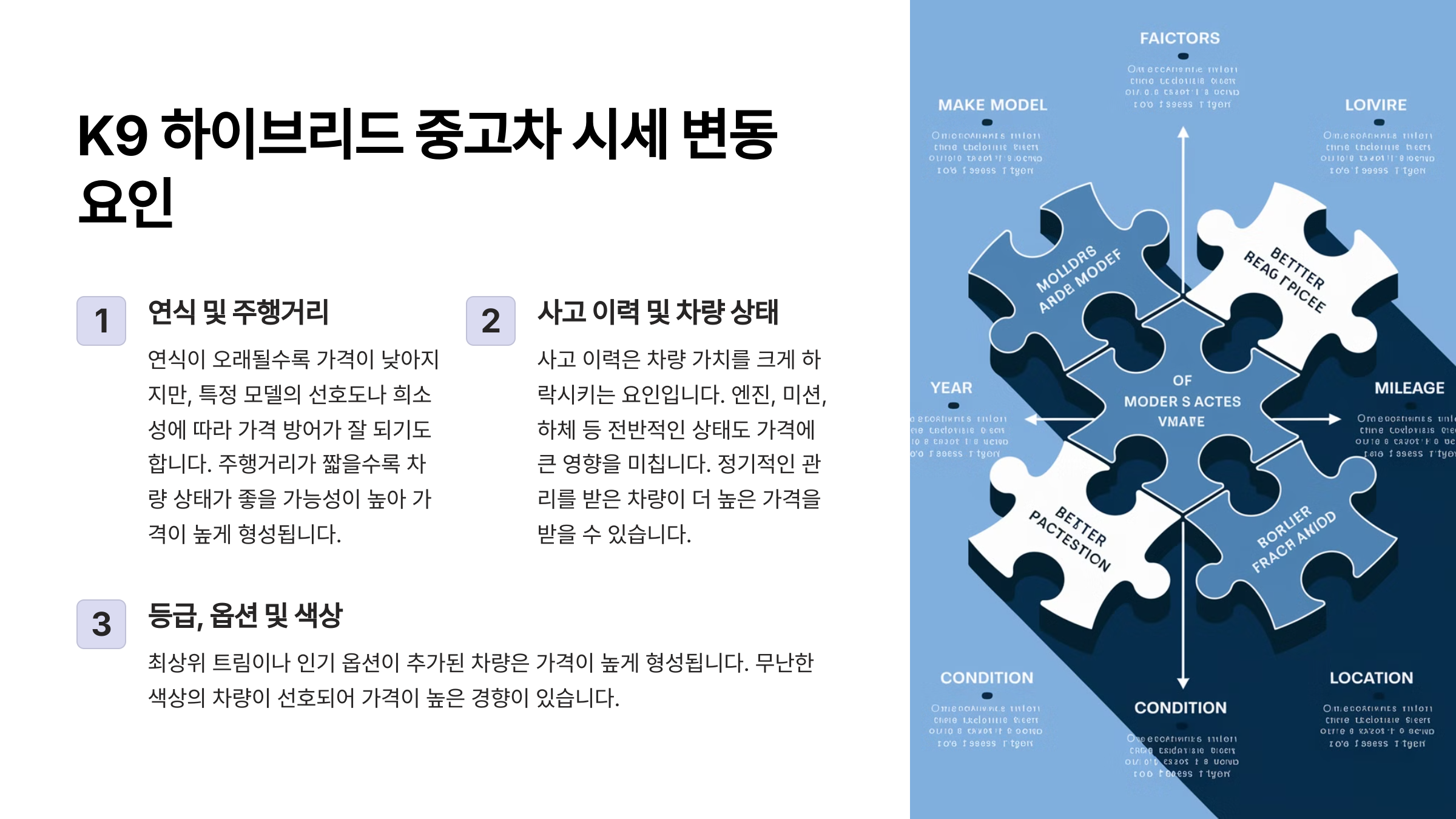 - 시장 상황: 중고차 시장의 전반적인 흐름, 즉 수요와 공급에 따라서도 가격이 변동합니다. 특정 시기에 K9 하이브리드에 대한 수요가 증가하면 가격이 상승할 수 있습니다.