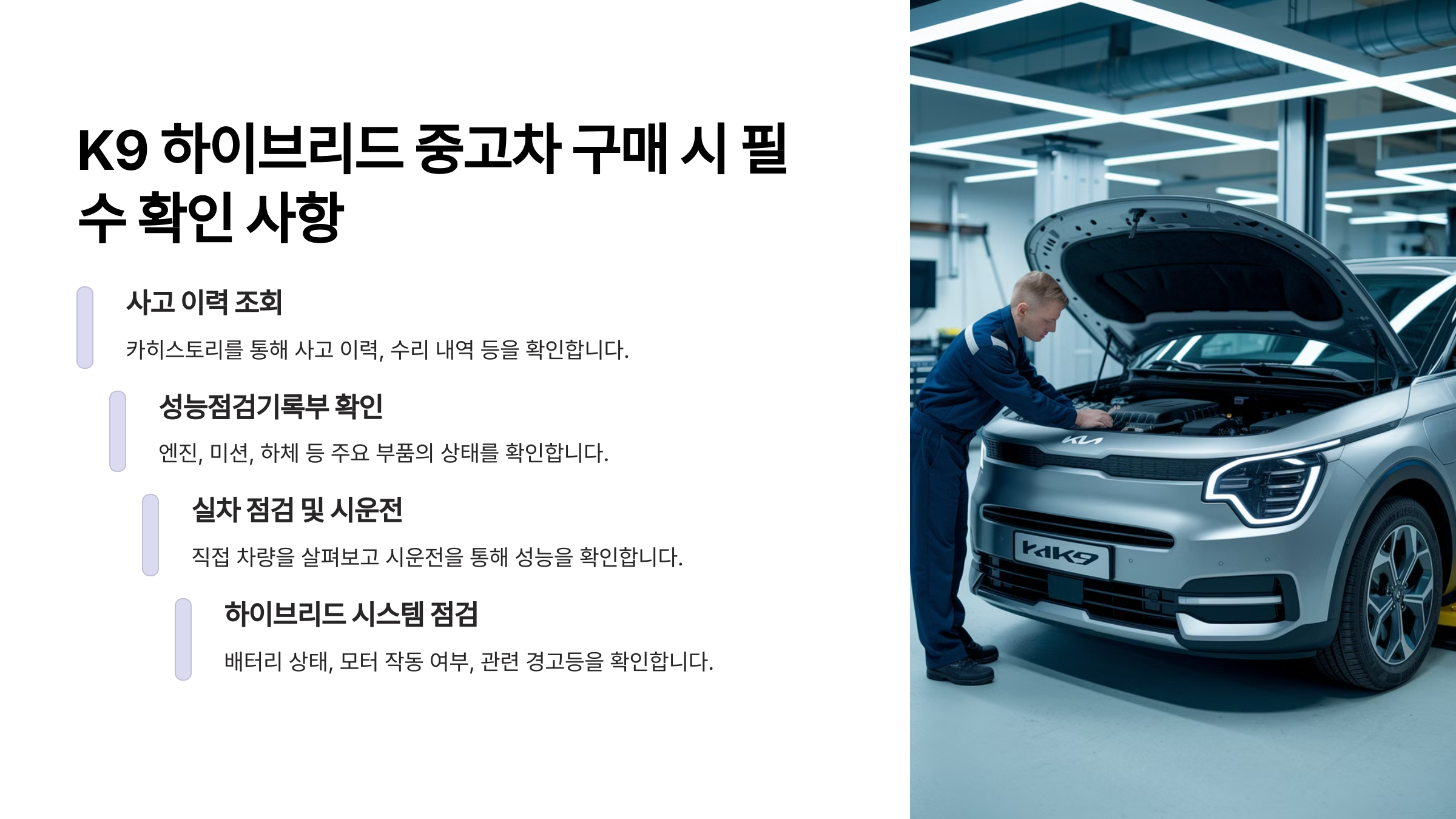 K9 하이브리드 중고차를 구매할 때는 다음 사항들을 반드시 확인해야 합니다. 꼼꼼한 확인만이 후회 없는 선택으로 이어집니다.