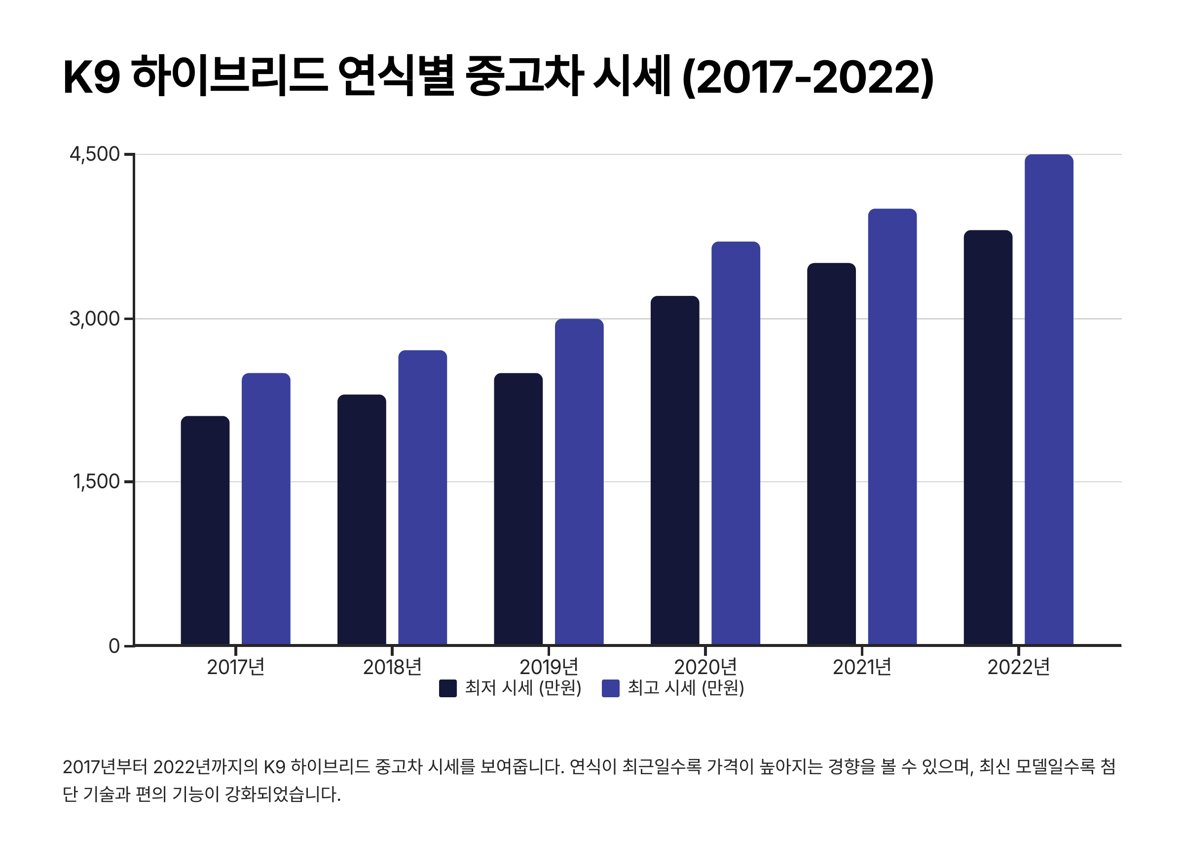 K9 하이브리드 중고차 시세를 연식별, 모델별로 상세하게 분석하여 제시합니다. 아래 표는 실제 중고차 매물 데이터를 기반으로 작성되었으며, 시장 상황에 따라 변동될 수 있습니다.