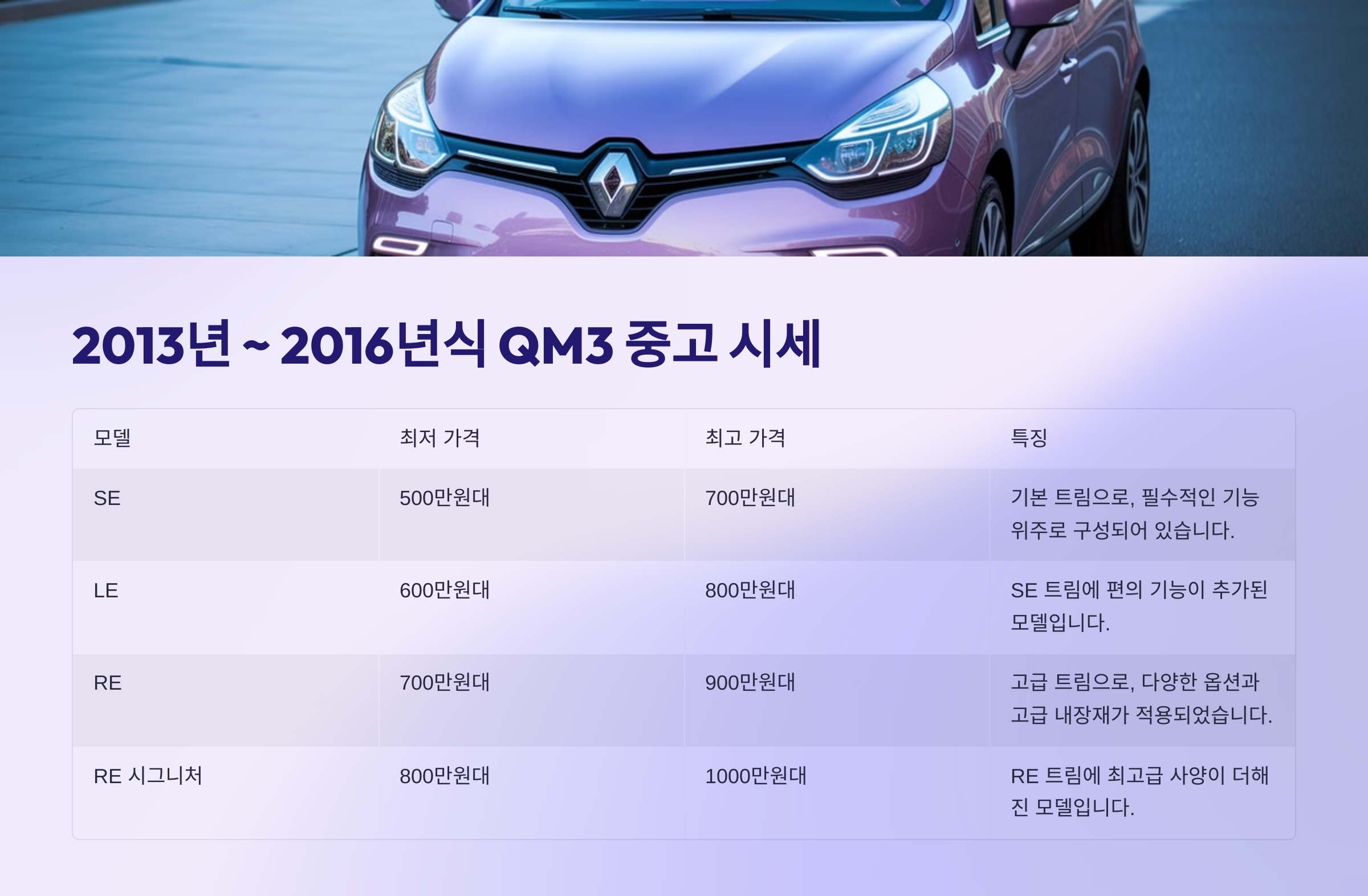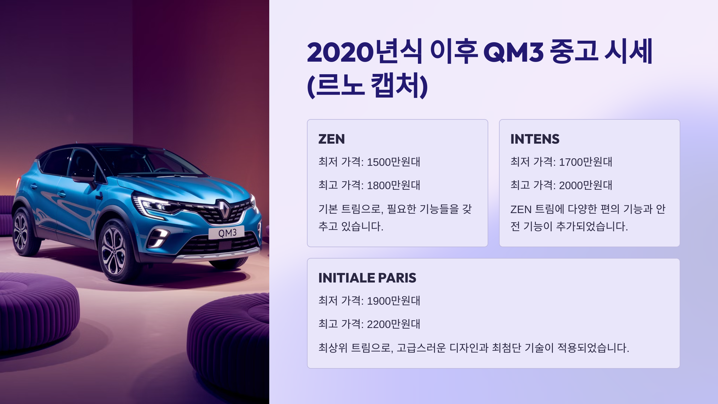 르노삼성 QM3는 뛰어난 연비와 스타일리시한 디자인으로 꾸준한 인기를 얻고 있는 소형 SUV입니다. 합리적인 가격으로 QM3 중고차를 구매하려는 분들이 많은데요. 하지만 중고차 시장은 정보 비대칭성이 크기 때문에 정확한 시세를 파악하는 것이 중요합니다. 이 글에서는 QM3 중고차 가격과 QM3 중고차 시세를 연식별, 모델별로 상세하게 분석하고, 성공적인 중고차 구매를 위한 가이드를 제공합니다. 믿을 수 있는 정보를 통해 합리적인 선택을 할 수 있도록 돕겠습니다.
