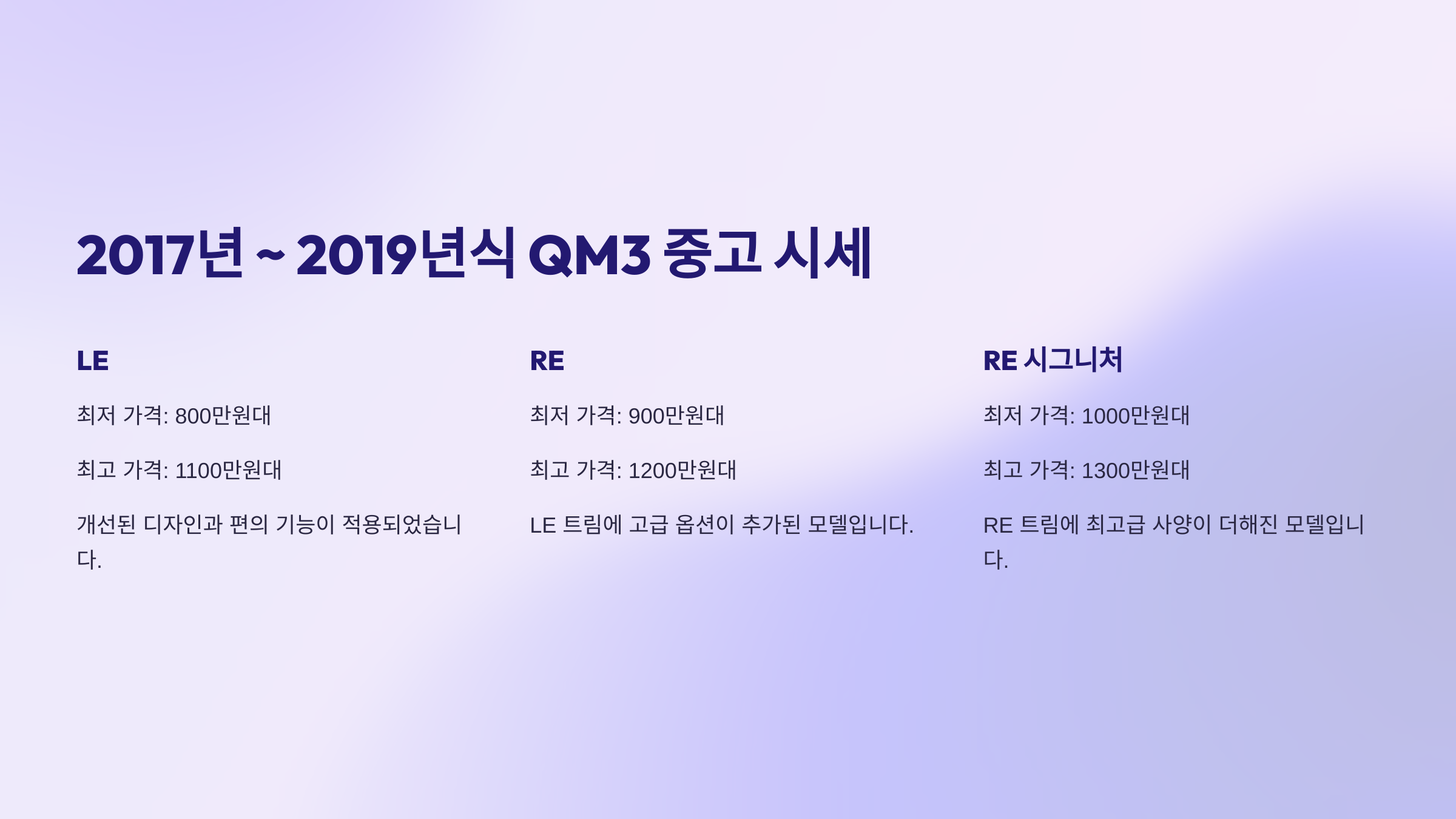 다음은 실제 중고차 매물 데이터를 기반으로 분석한 QM3 연식별 중고차 시세입니다. 각 연식별 특징과 함께 시세 범위를 제시하여 구매 시 참고할 수 있도록 했습니다.