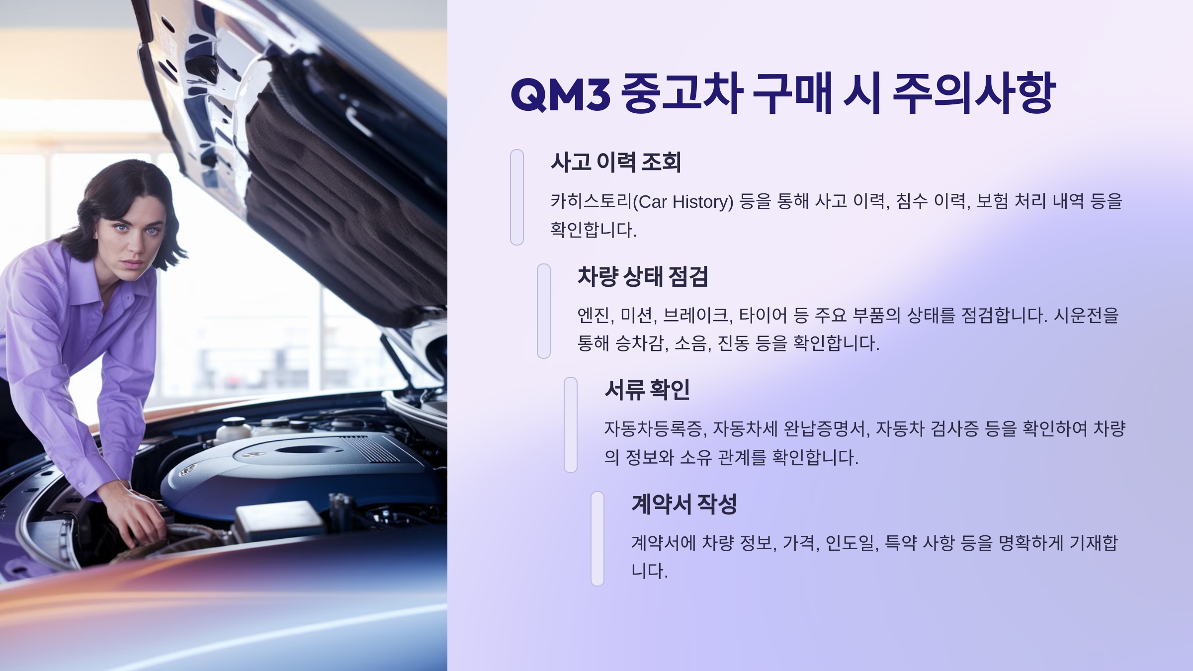 QM3 중고차 가격을 알아보는 것만큼 중요한 것은 꼼꼼한 차량 점검입니다. 다음은 QM3 중고차 구매 시 반드시 확인해야 할 사항입니다.
