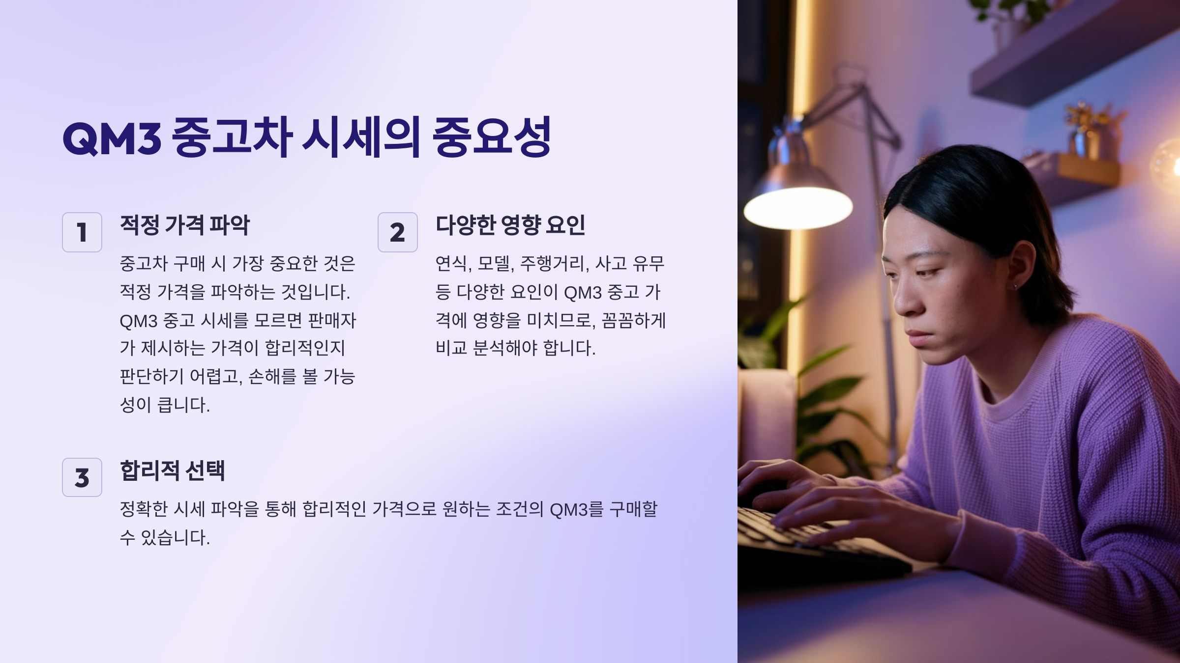 중고차를 구매할 때 가장 중요한 것은 적정 가격을 파악하는 것입니다. QM3 중고 시세를 모르면 판매자가 제시하는 가격이 합리적인지 판단하기 어렵고, 손해를 볼 가능성이 큽니다. 연식, 모델, 주행거리, 사고 유무 등 다양한 요인이 QM3 중고 가격에 영향을 미치므로, 꼼꼼하게 비교 분석해야 합니다.