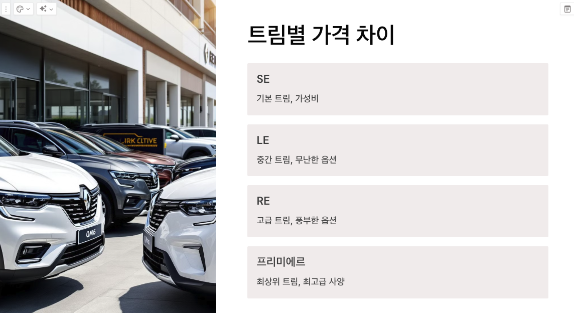 이제 QM6 트림별 가격 차이를 살펴볼게요. 트림에 따라 옵션과 성능이 달라지므로 가격 차이가 발생할 수 있어요. 🎯