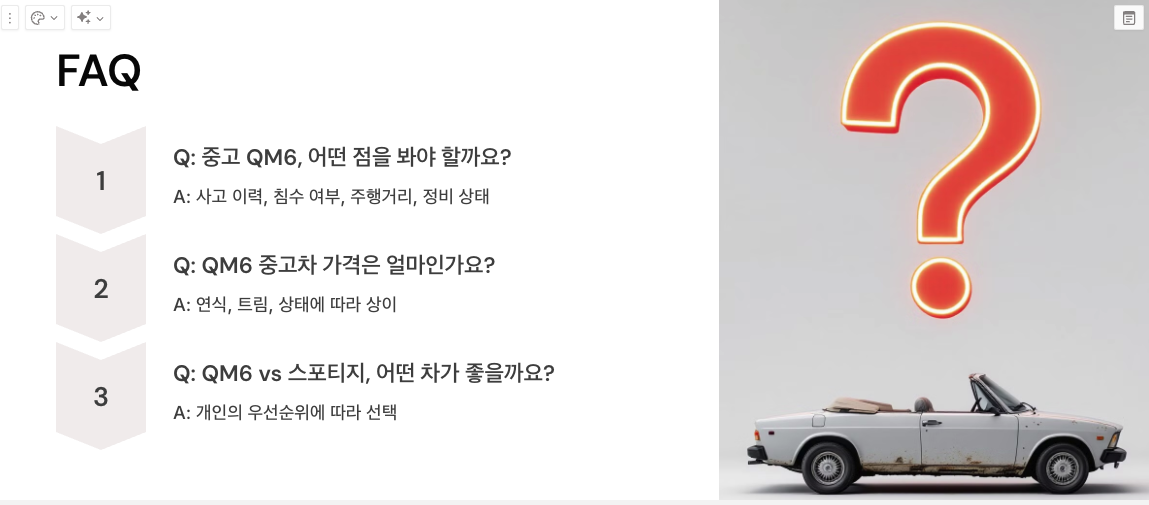 이제 QM6 중고차와 관련된 자주 묻는 질문(FAQ)을 확인해볼까요? 📌