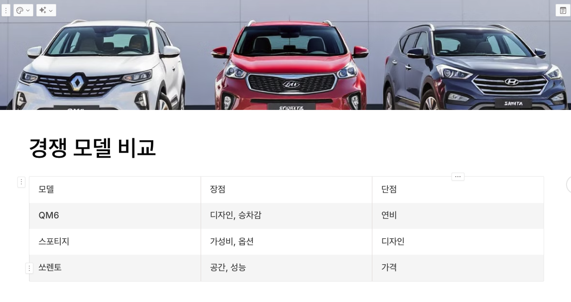 QM6는 현대 싼타페, 기아 쏘렌토, 쉐보레 이쿼녹스 등과 경쟁하는 중형 SUV예요. 중고차 시장에서도 이 모델들과 자주 비교된답니다.