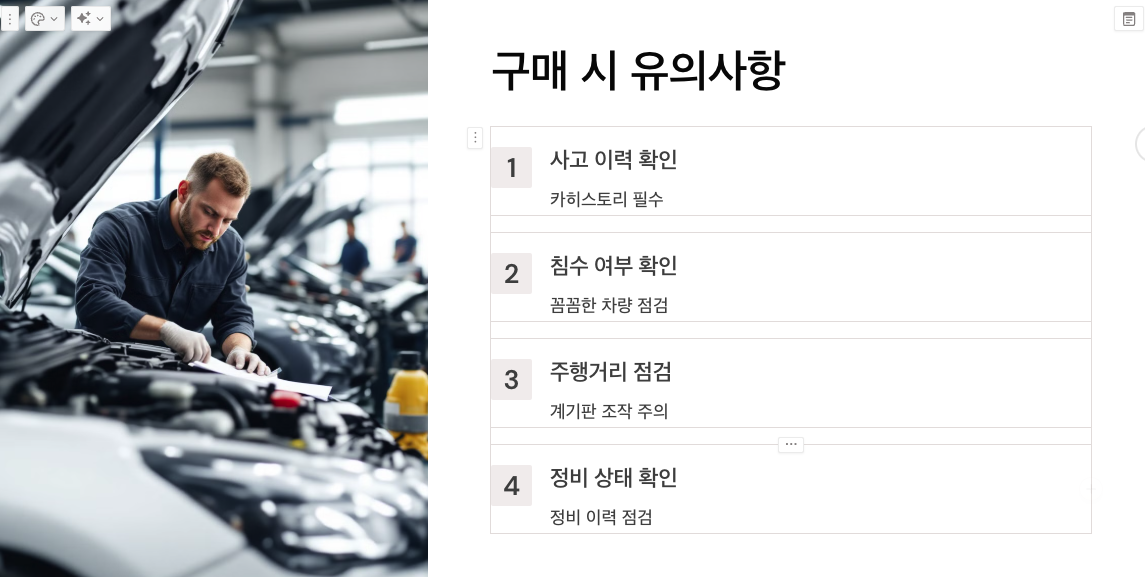 ✅ 사고 이력 확인 차량의 사고 이력을 반드시 조회해야 해요. 무사고 차량이 가장 좋지만, 경미한 사고 차량은 가격이 저렴한 만큼 가성비가 좋을 수도 있답니다.
