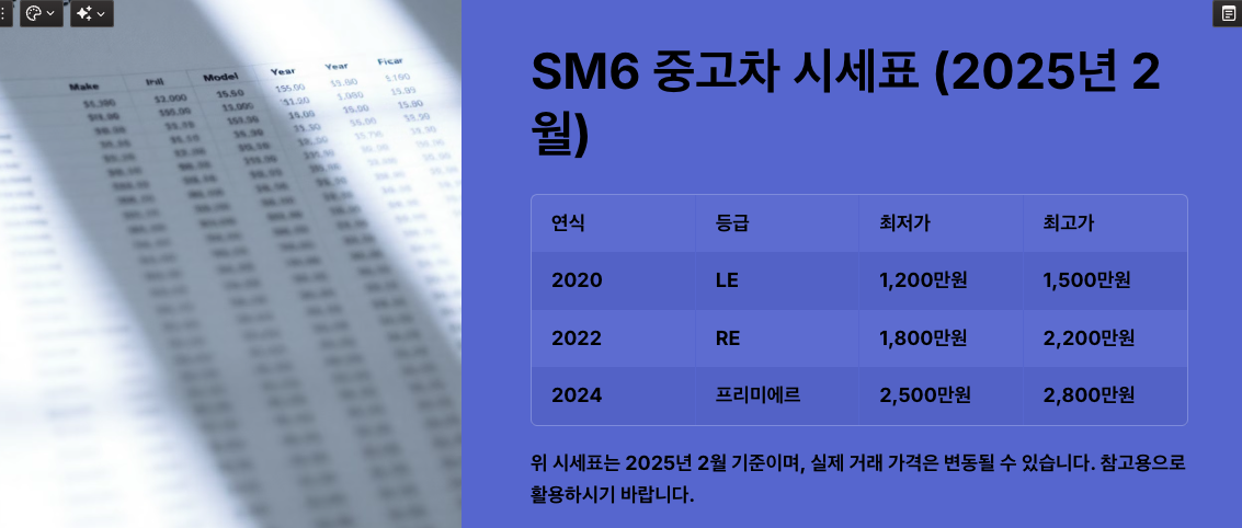 📌 이제 2025년 2월 기준 SM6 중고차 시세표를 확인해볼까요?