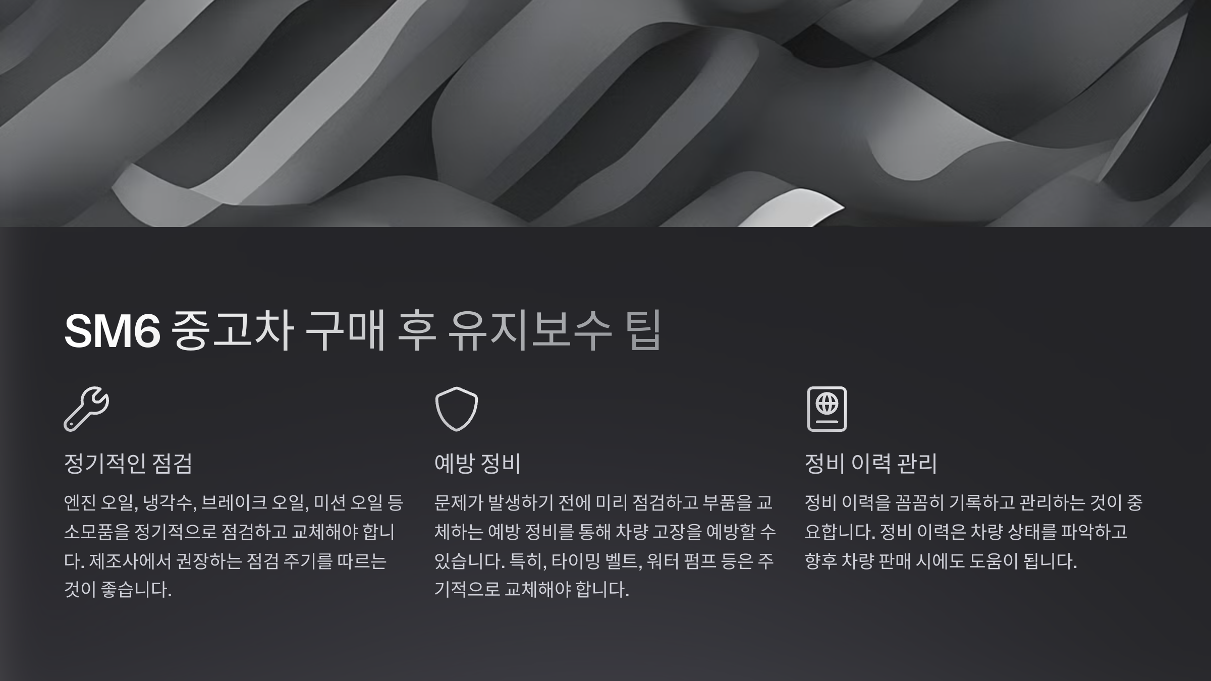 SM6 중고차를 구매한 후에는 꾸준한 유지보수를 통해 차량 상태를 최상으로 유지하는 것이 중요합니다. 다음은 SM6 중고차 유지보수 팁입니다.