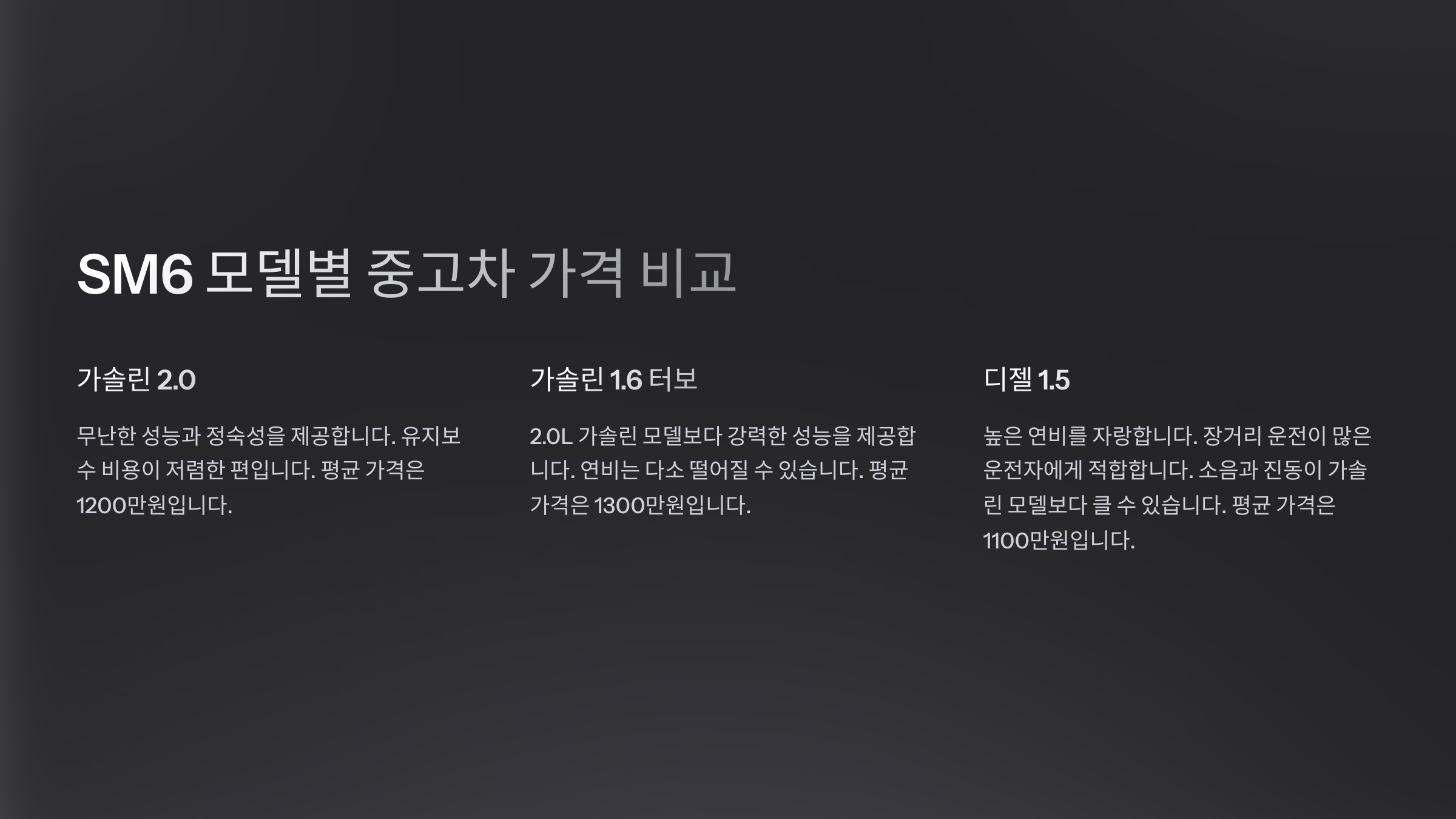 3. SM6 모델별 중고차 가격 비교 (가솔린, 디젤, LPG)