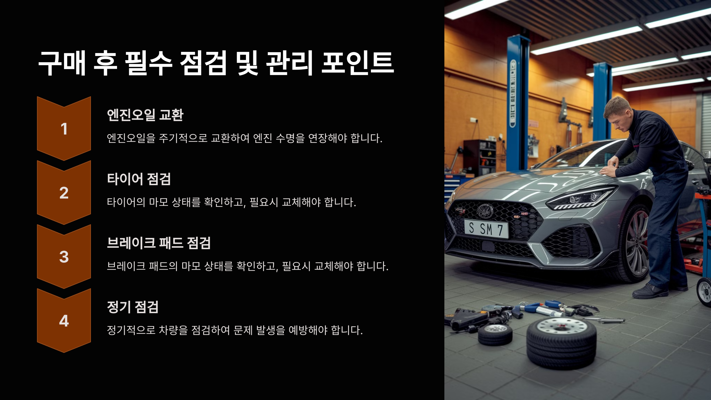 - 정비 점검: 중고차 구매 후에는 반드시 정비소에서 차량 점검을 받는 것이 좋습니다. 엔진 오일, 냉각수, 브레이크 오일 등 소모품 교환 시기를 확인하고, 필요한 경우 교체하는 것이 좋습니다.