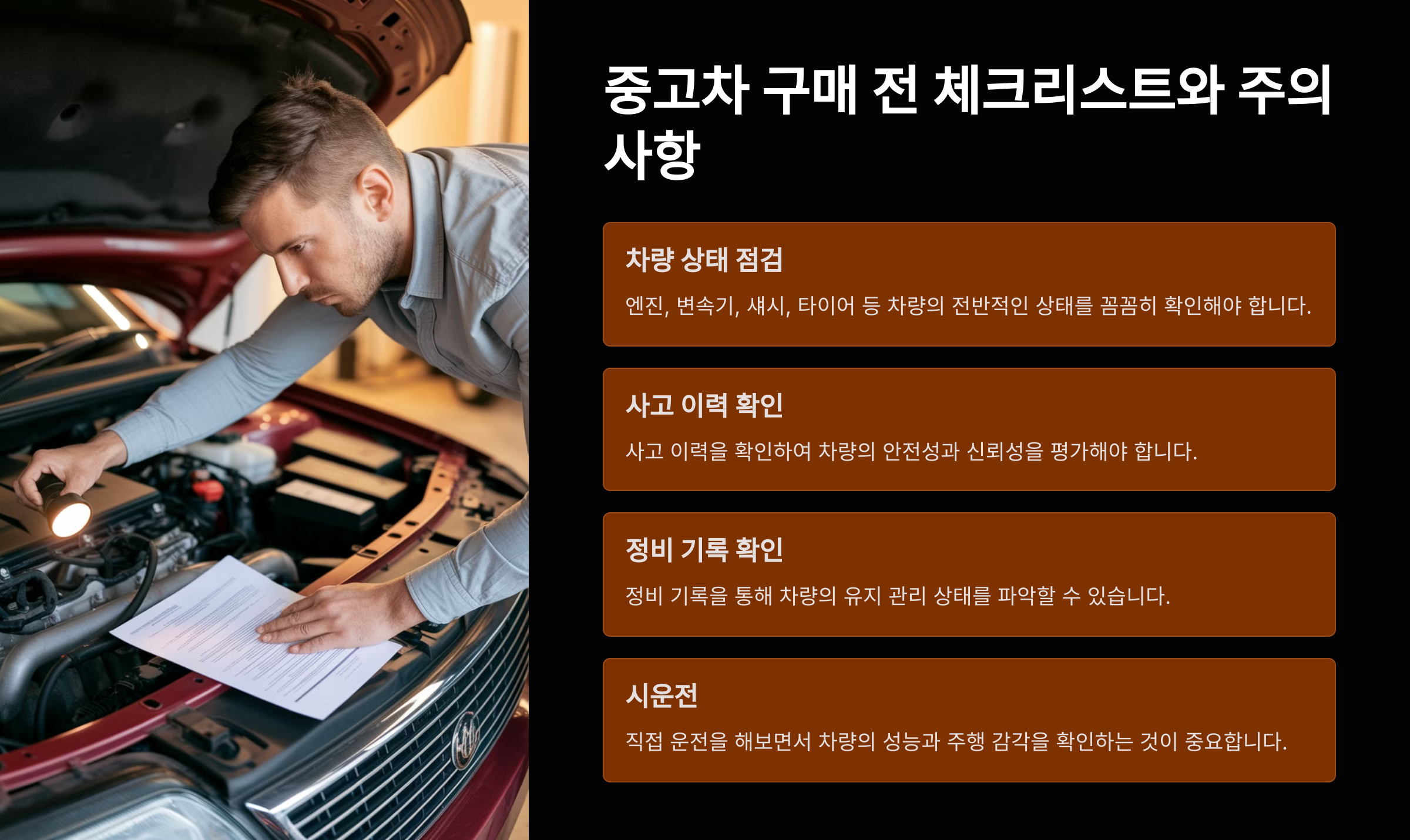 - 차량 상태 확인: 차량 외관, 엔진, 미션, 하체 등을 꼼꼼히 확인해야 합니다. 특히 사고 이력, 침수 여부 등을 확인하고, 시운전을 통해 주행 성능을 직접 확인하는 것이 좋습니다.