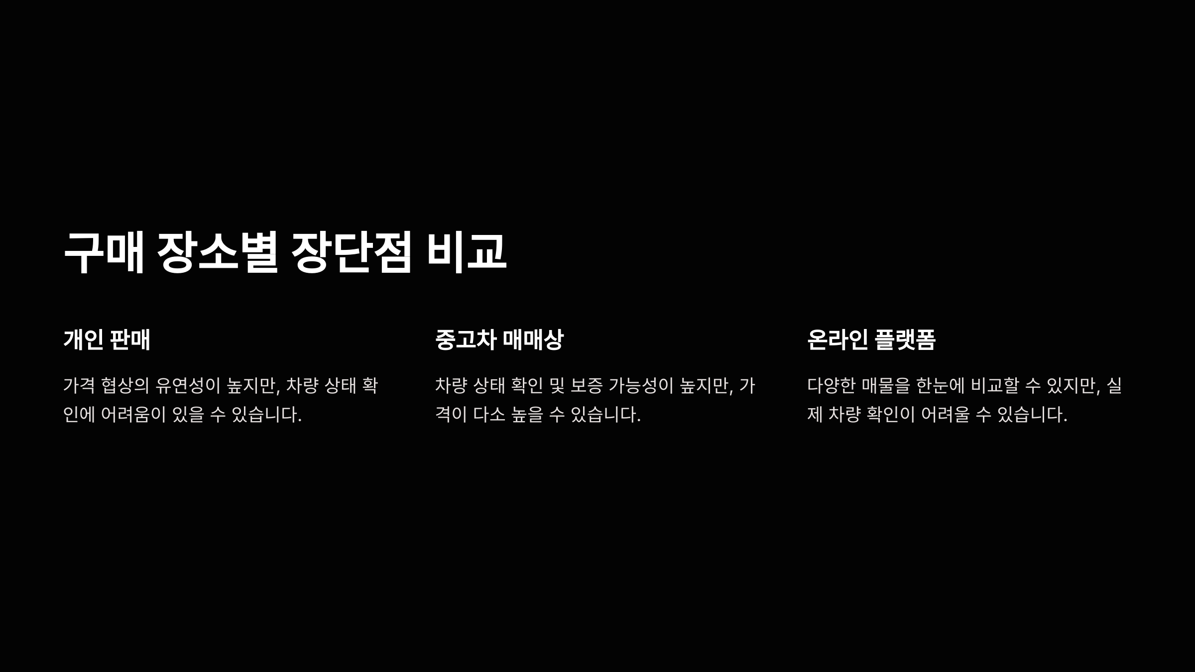 - 온라인 중고차 플랫폼: 온라인 중고차 플랫폼은 시간과 장소에 구애받지 않고 다양한 중고차를 검색할 수 있다는 장점이 있습니다. 하지만 사진만으로는 차량 상태를 정확히 파악하기 어렵다는 단점이 있습니다.