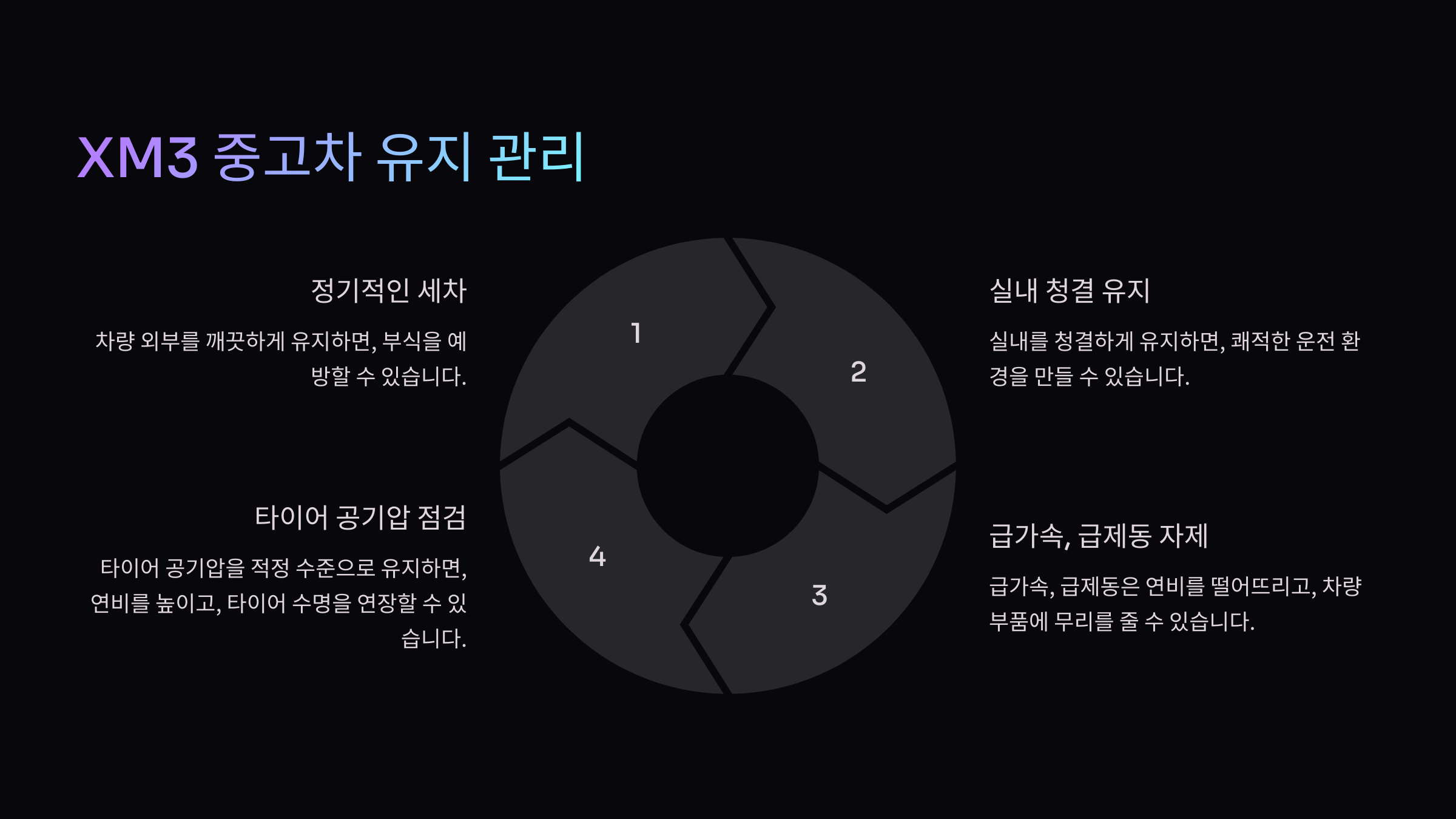 위 유지 관리 요령을 실천하여 XM3 중고차를 오랫동안 최상의 상태로 유지하시길 바랍니다.