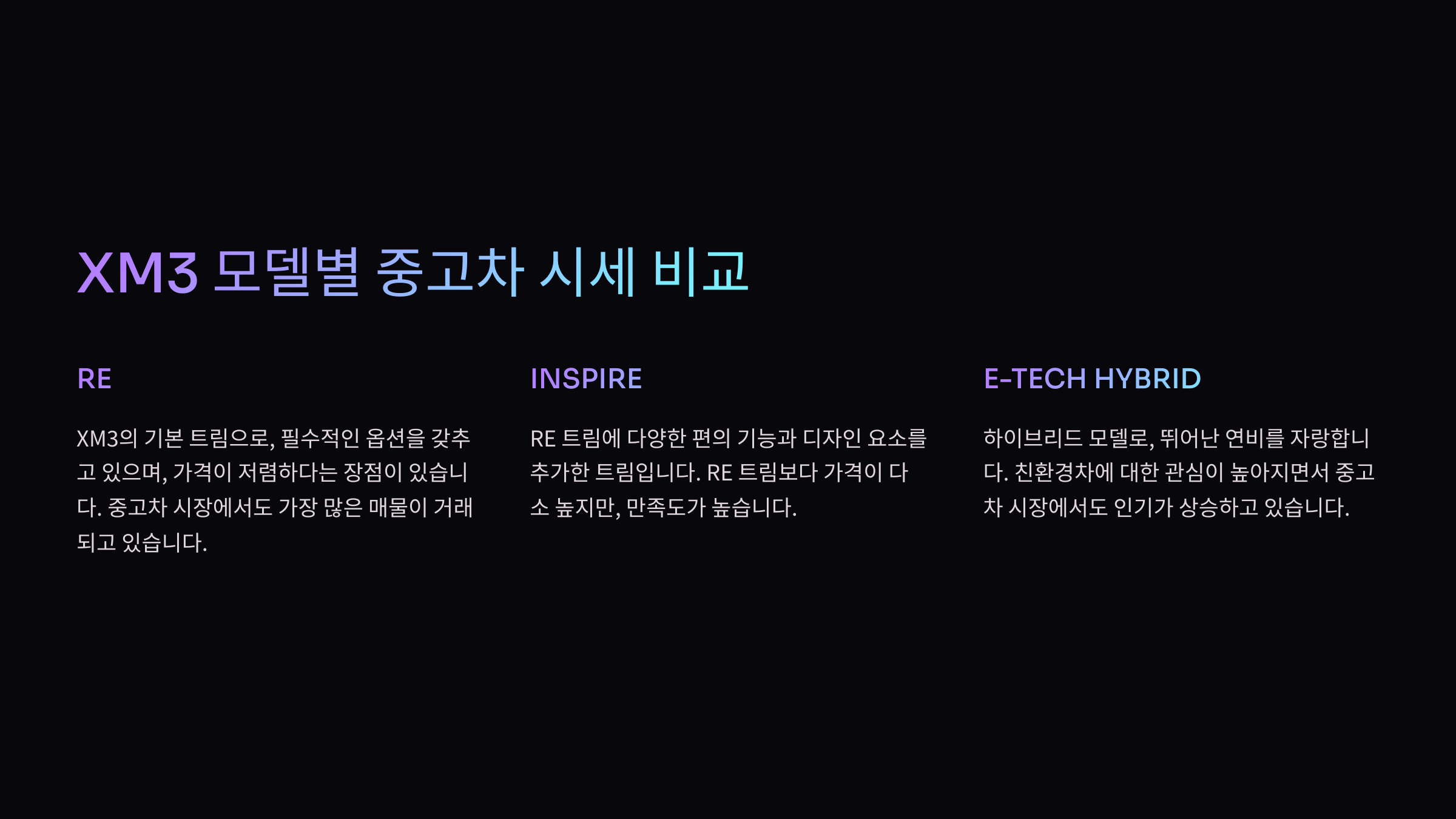 3. XM3 모델별 중고차 시세 비교: RE, INSPIRE, E-TECH HYBRID 등
